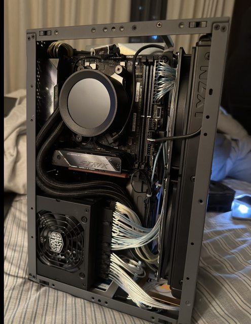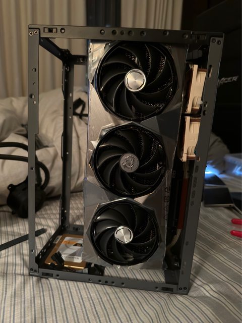 裝完後發現不知道是不是顯卡實在是太大張會往面板那個方向歪過去,所以拿了一些線材繞過機殼把顯卡拉回來固定