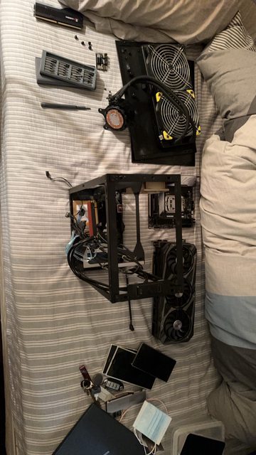 先把原本的電腦先大卸八塊,把要沿用的東西跟不延用的東西分開(空間不夠只能拿床鋪來當桌子用….)