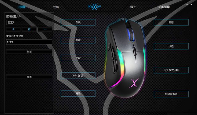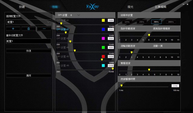 性能頁面可設定滑鼠的DPI(靠第二中鍵作切換)