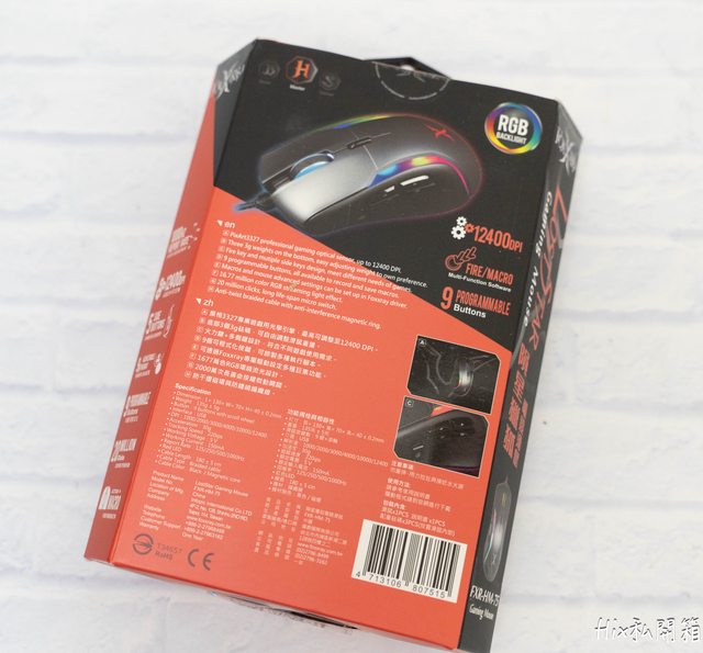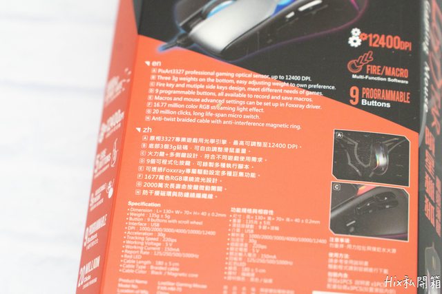 滑鼠外盒正面寫著4大功能,1000HZ回報率、最高12400DPI、9個可程式按鍵以及RGB背光