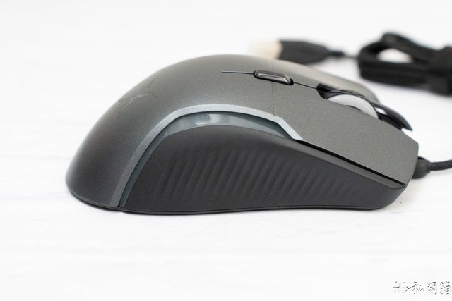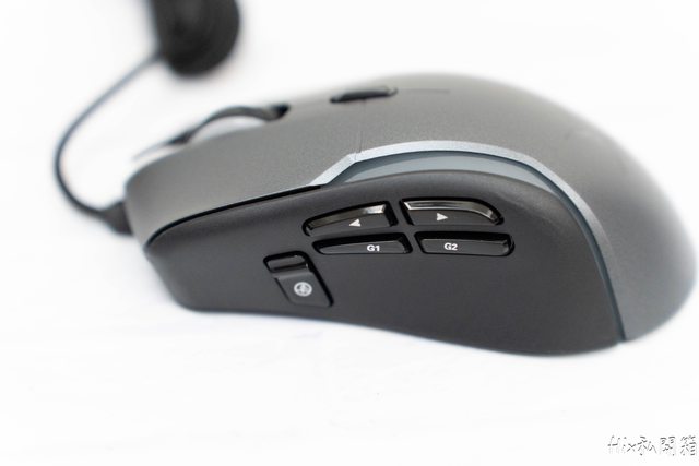 右手姆指區有著5顆按鍵,上方除了定番的左右鍵及滾輪外還配一顆第二中鍵(DPI調整)