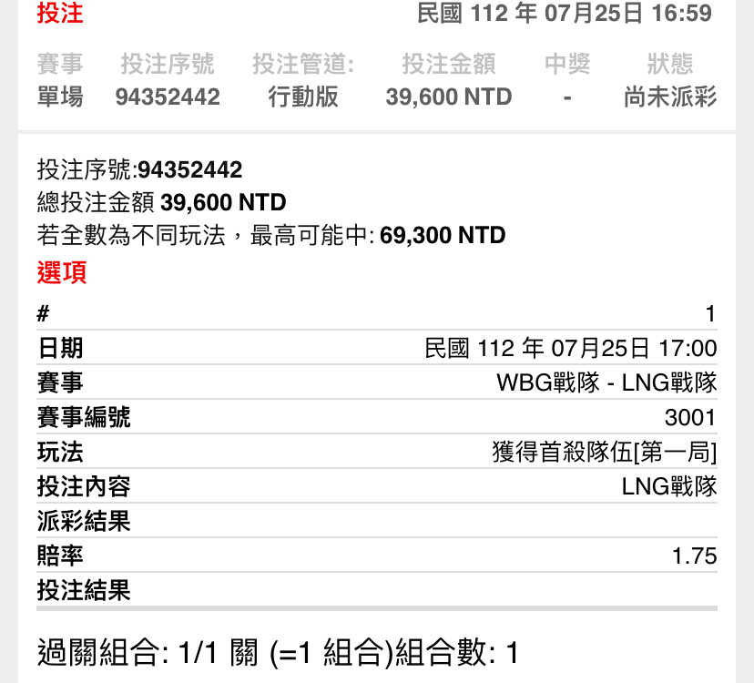 噓 a2010561501: 這局100趴 wbg 贏了 1.200.21.153 07/25 17:46