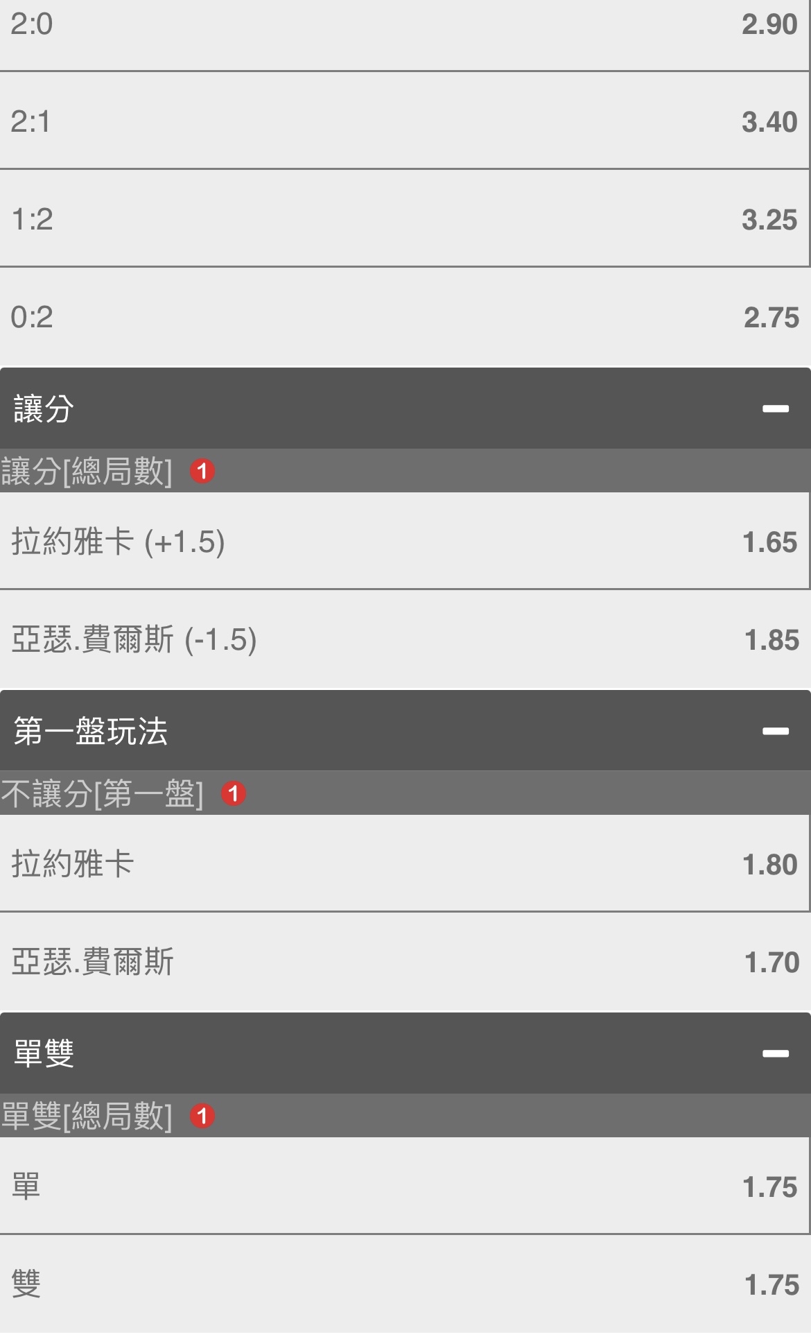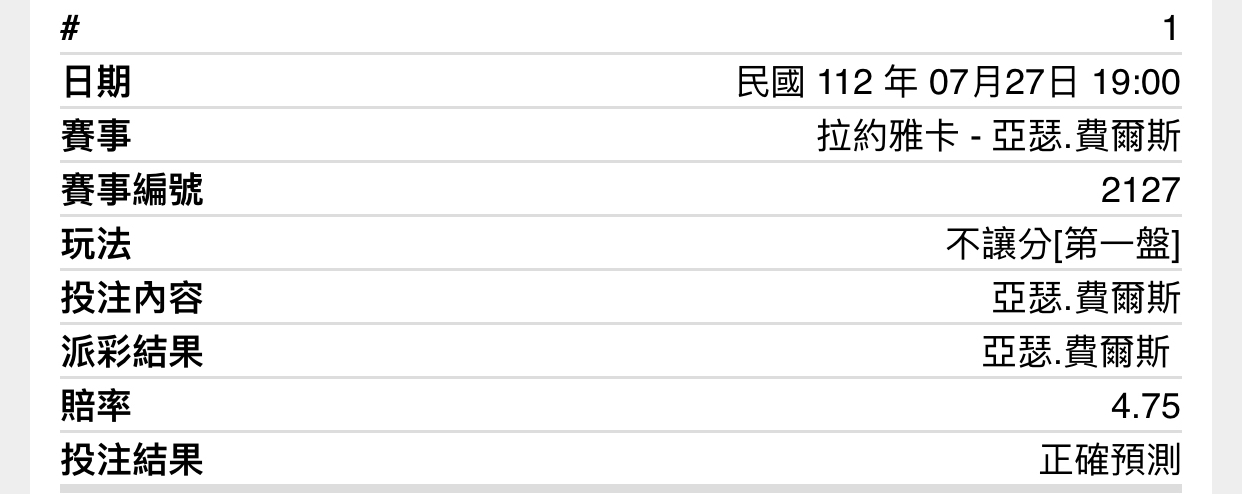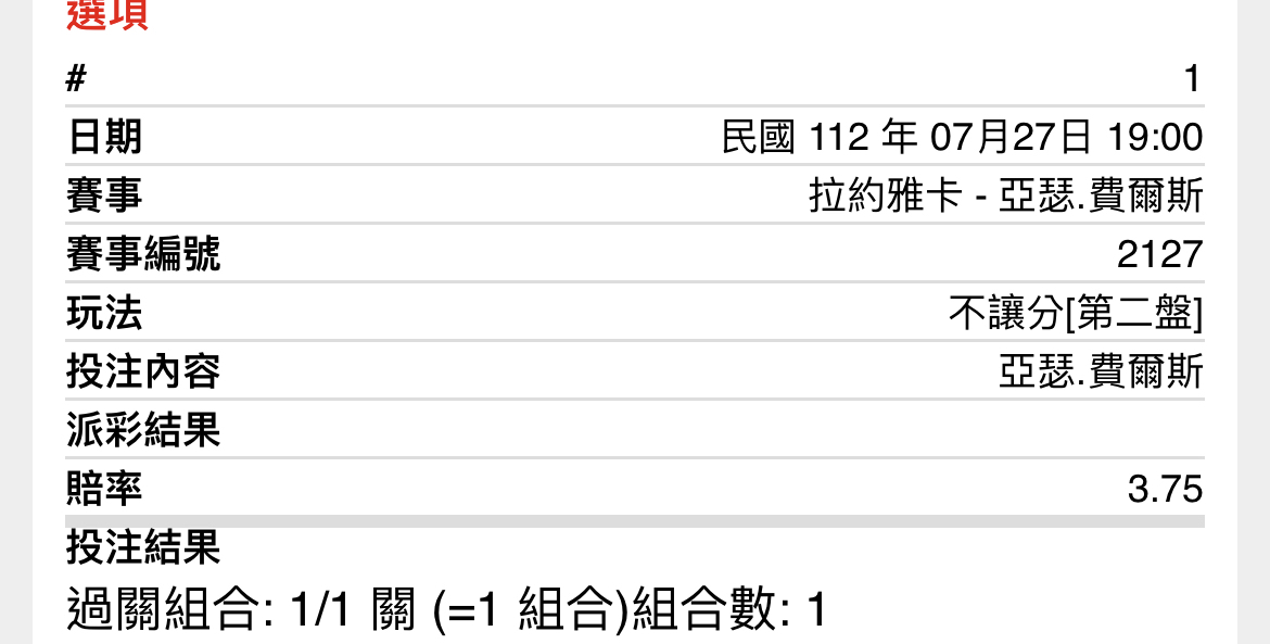 一 二 F 拉約雅卡 5 5 0 亞瑟.費爾斯 7 7 2 win ATP漢堡公開賽 紅土 -- ※ 發信站: 批踢踢實業坊(ptt-web.org.tw), 來自: 125.230.149.251 (臺灣) ※ 文章網址: https://ptt-web.org.tw/SportLottery/M.1690455070.A.EFD
