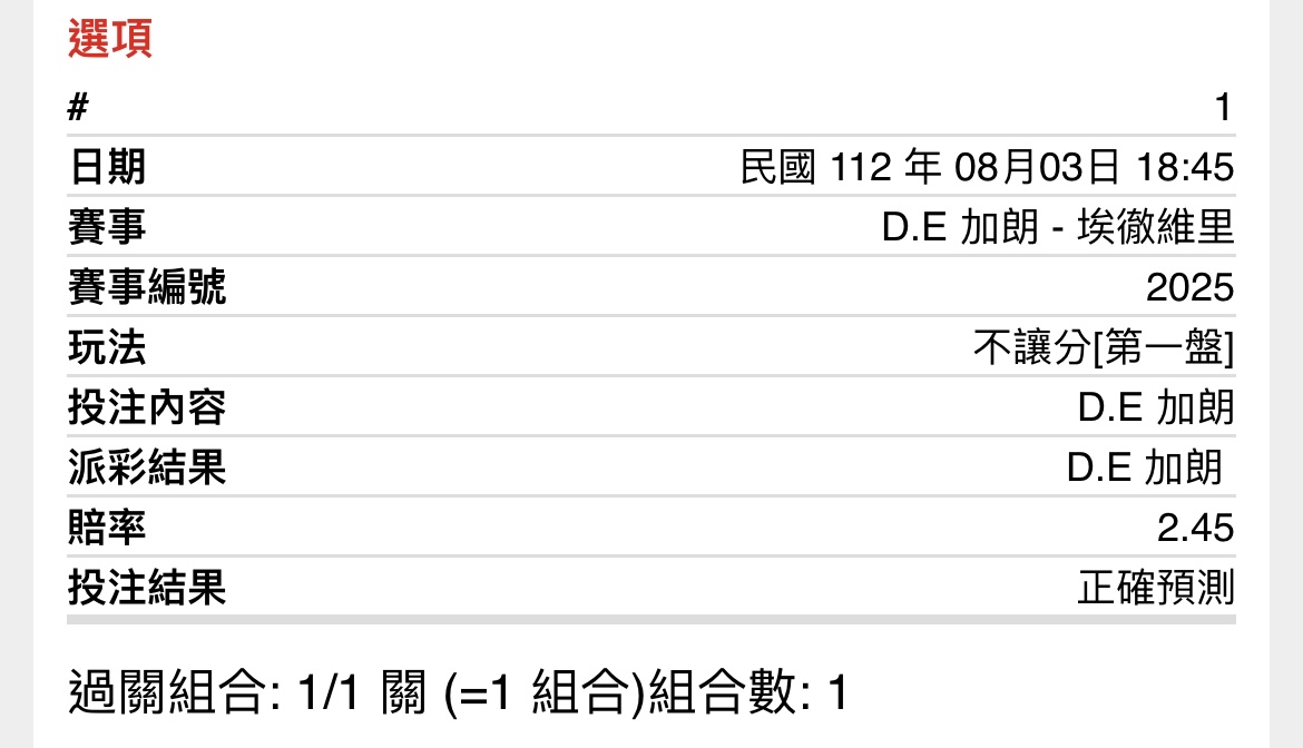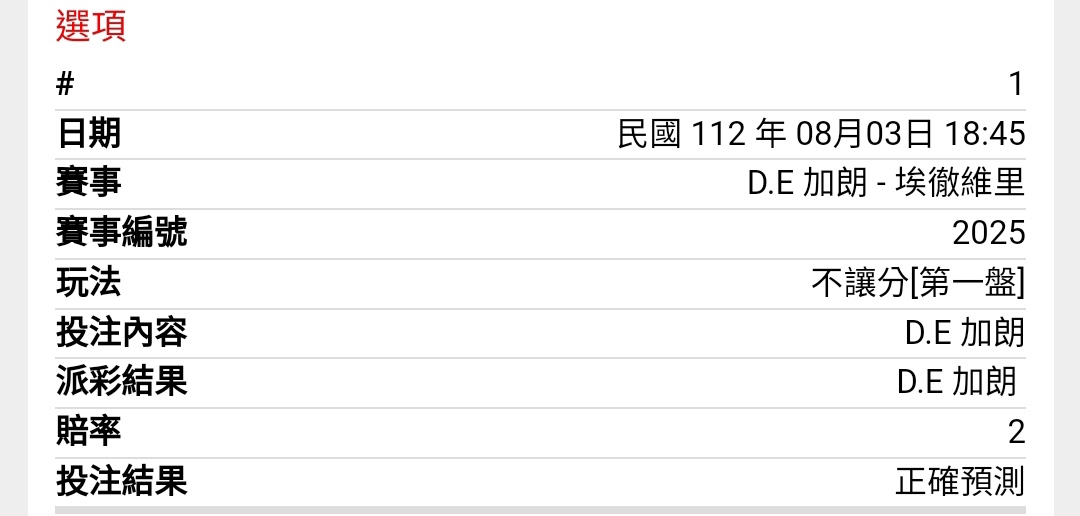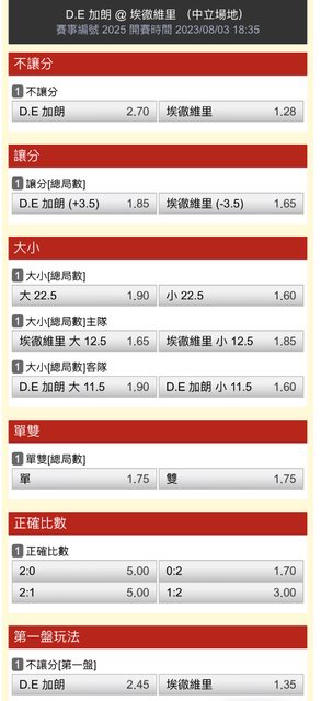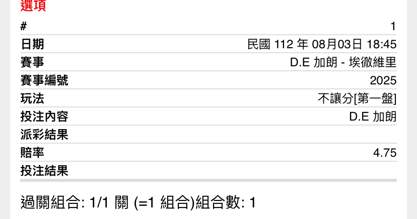 一 二 三 T D.E加朗 7 3 4 1 埃徹維里 6 6 6 2 第一盤D.E加朗先發 第二盤埃徹維里先發 第三盤D.E加朗先發 -- ※ 發信站: 批踢踢實業坊(ptt-web.org.tw), 來自: 218.166.131.127 (臺灣) ※ 文章網址: https://ptt-web.org.tw/SportLottery/M.1691059153.A.85A