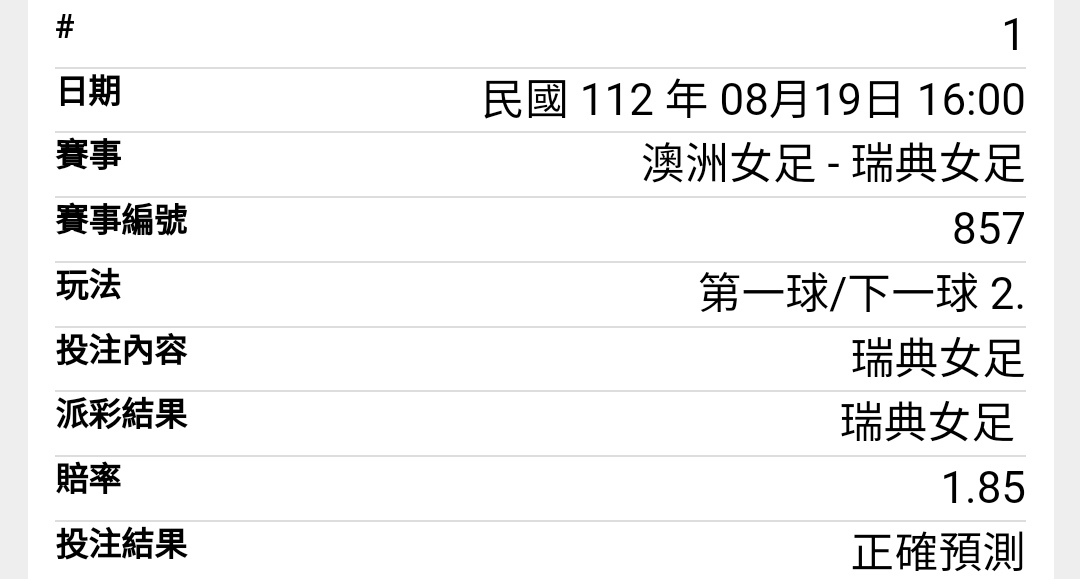 推 hairstyle: 早上就直覺這場0:2,所以賽前買了瑞典 101.8.14.72 08/19 17:49