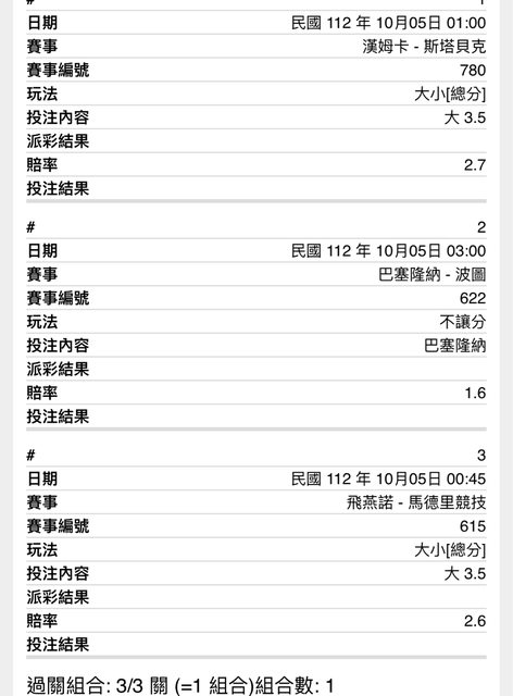1. 挑比賽的時候發現有宇宙第一聯賽拿來串,挪超就是大 2. 巴薩可能1:0不會讓分,拿不讓來串就好 3. 有荷甲的比賽就是大,大起來 3*1 100 https://i.imgur.com/l9vk3uF.jpg