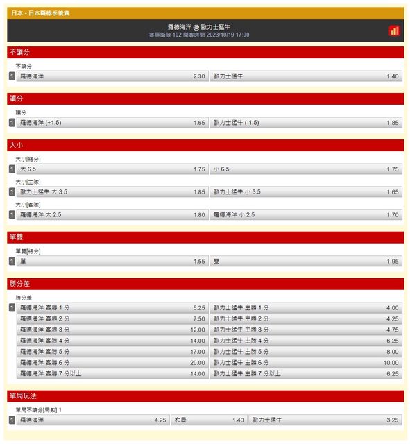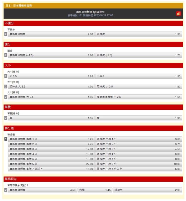 推 po00002001: 廣島阪神6.5小羅德歐牛6.5大 101.12.89.97 10/19 15:36