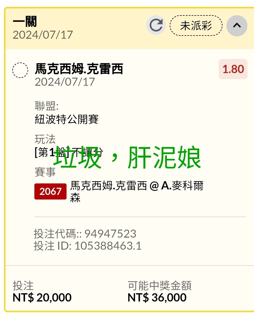 推 w2658741: -1.5 有2.40高賠 111.71.215.137 07/18 00:46