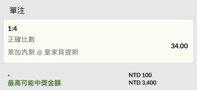 週末心血來潮玩個樂透 看好主隊讓分勝 推 萊加內斯1:4皇家貝提斯 看球囉 --