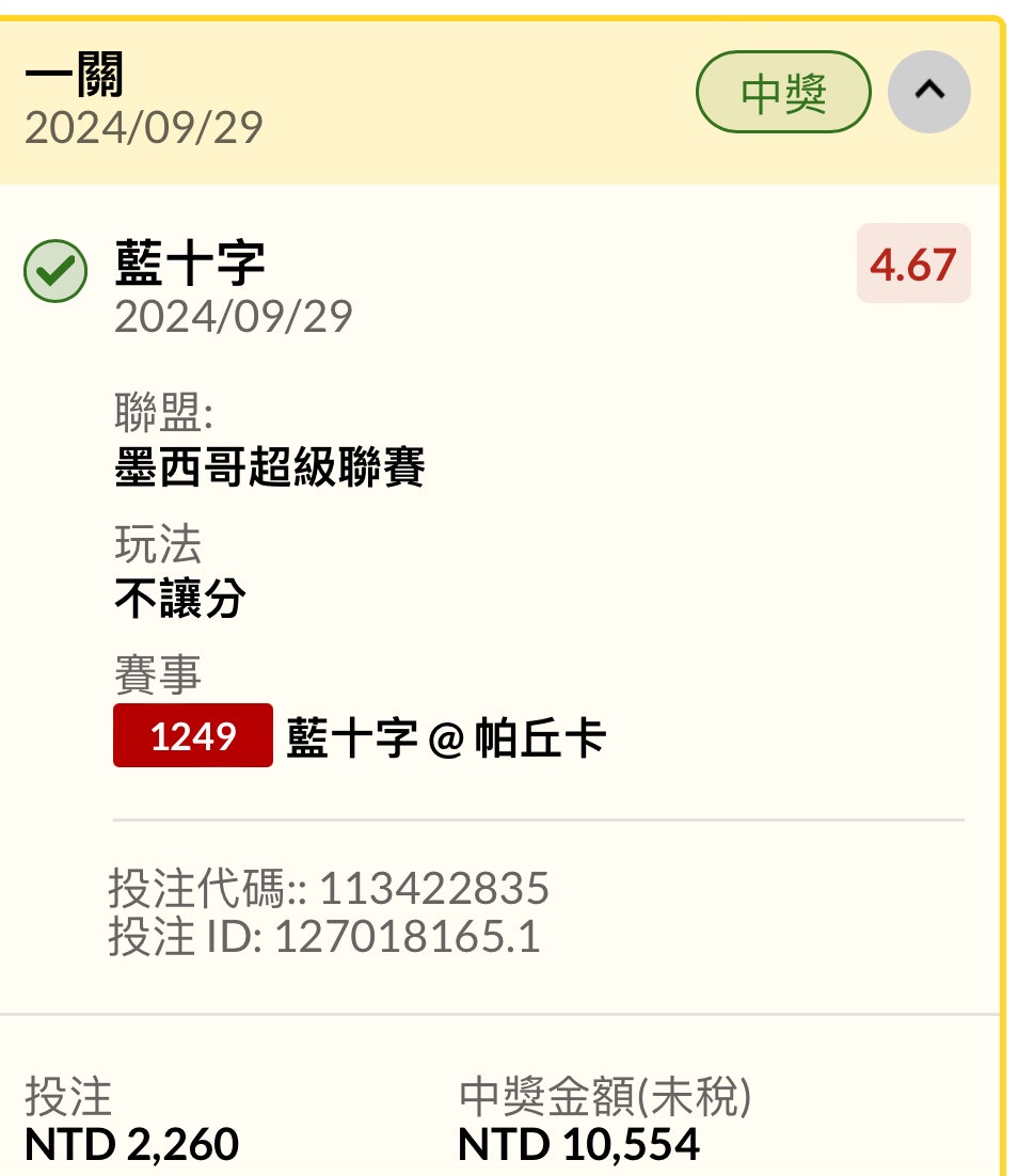 推 fion0422: 上了上1.5 藍十字1.5+獨贏 大分佛場繼 1.200.37.19 09/29 09:55