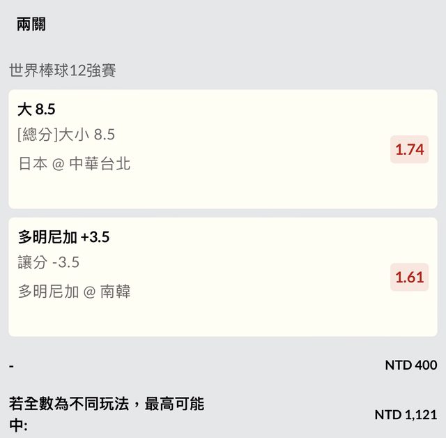 今晚2場的WBSC真的不好買,看了很久終於才有比較有fu,台日場覺得開大分比受讓分的