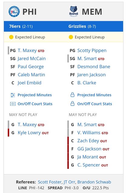 費城76人 -2.5 1.72 明天蘿莉受傷不打 Maxey有機會會打