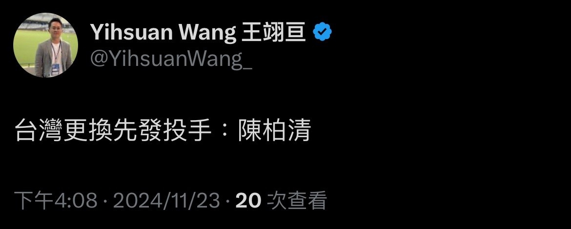 → peter5140: 台灣改陳柏青先發 1.200.66.236 11/23 16:12