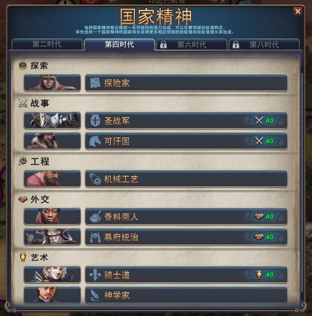 國家精神分別在時代2、4、6、8可以選擇(這些時代都有完全不同的選擇)