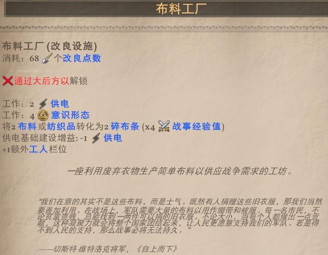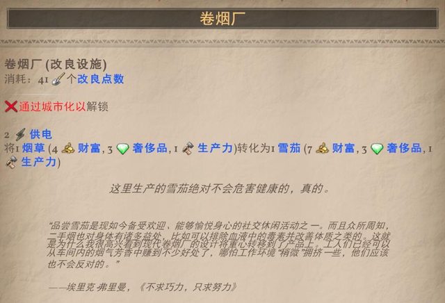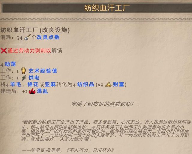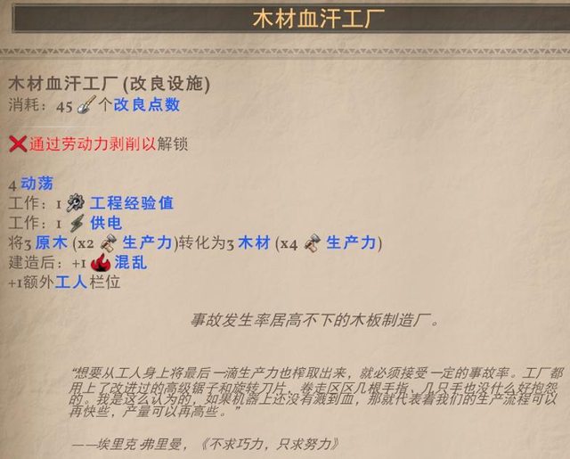 捨棄了帶來食物的效果 但卻能夠沒有工人卻能生產棉花2的能力,有工人則4棉花,但一樣沒有食物生產