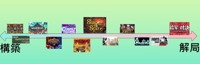 先定義一下,本文所指的卡牌,是指回合制玩法、多關卡的遊戲, 雖然叫卡牌,但卡牌只是常見的包裝,用技能、寶石、道具也行。 至於肉鴿rogue-like定義太多,就不解釋了。 大多數的卡牌肉鴿遊戲,都包含著兩種要素,也就是「構築」「解局」, 相信有些玩家,喜歡玩將軍 對決,但卻對怪物火车感到不適應; 反之喜歡租戶賭財運的玩家,卻不見得喜歡玩將軍 對決, 明明這幾款遊戲的好評率都非常高,看起來玩法也都類似, 這就是遊戲中「構築」和「解局」的比例不同所致。 畢竟這兩種要素的設計,先天上是互相衝突的。 有著高構築感,解局感就會薄弱;有著高解局感,構築感就會不足。 以下的光譜表,是個人體感製作,不同玩家感受可能會有些許差異。 https://i.imgur.com/9j0cq60.png