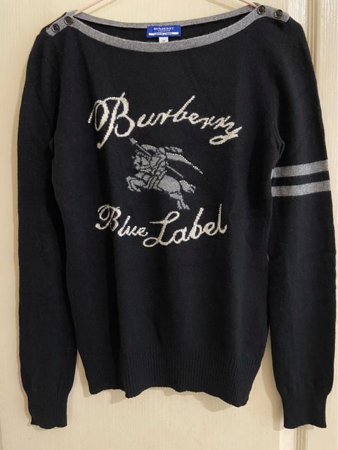 38號 肩36 胸44 長59(公分) 穿過2~3次 毛40% 水鑽完整 原本就是不規則排列 3.Burberry blue label 黑色戰馬圖騰上衣 1880含全家運費