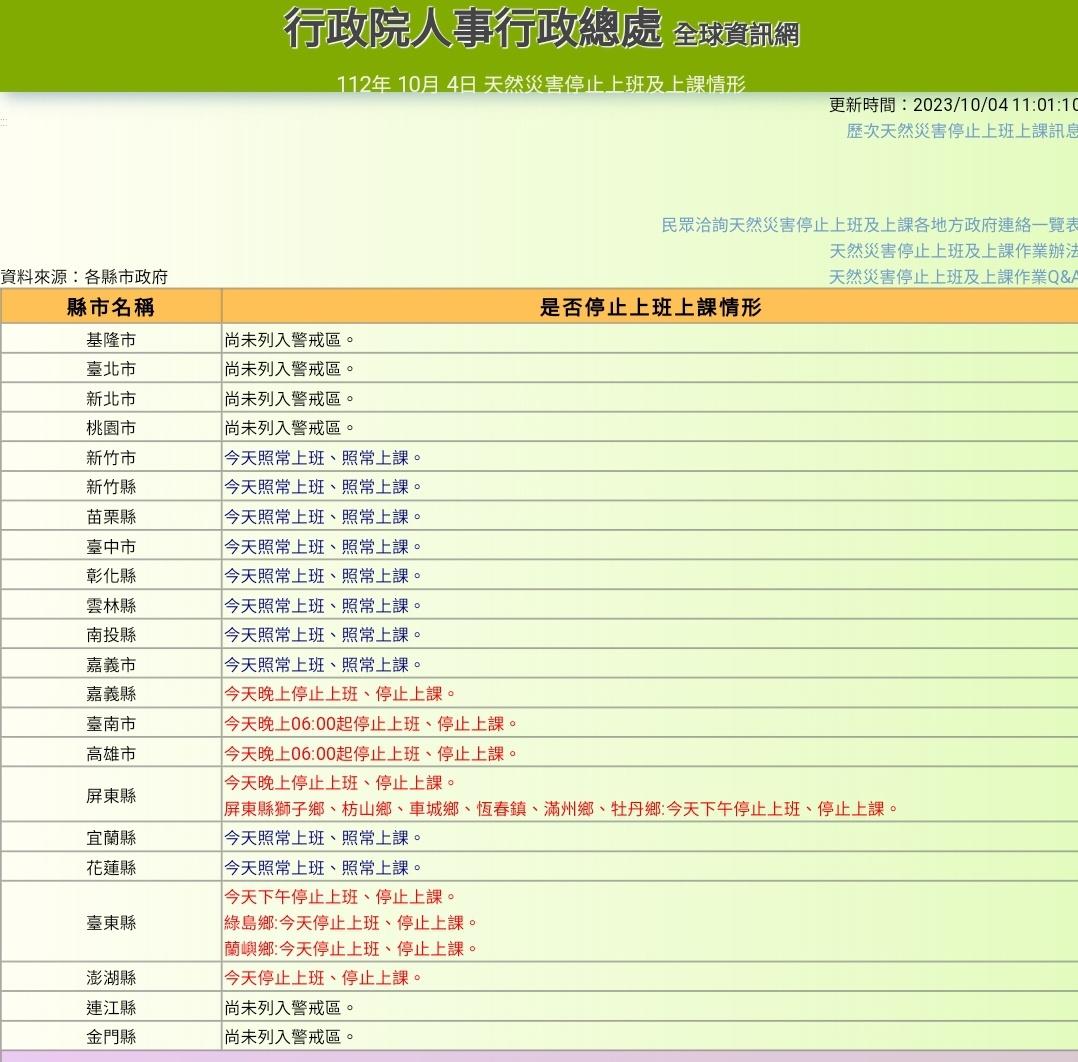 fspmlp : 台南高雄屏東晚間6時起停止上班、停止上課 10/04 11:02