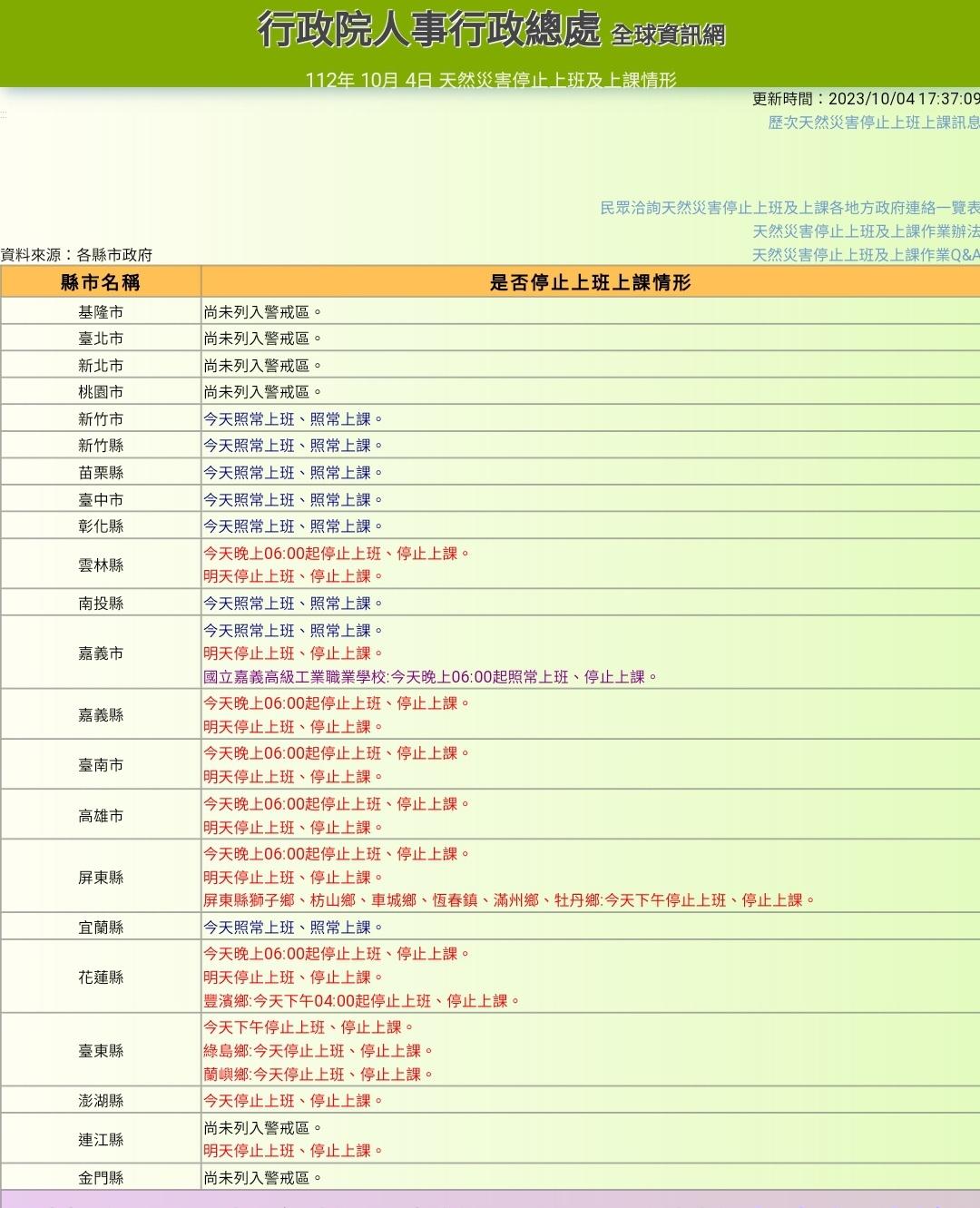 → fspmlp : 目前宣布5日停班停課縣市:台南高雄花蓮 10/04 16:15