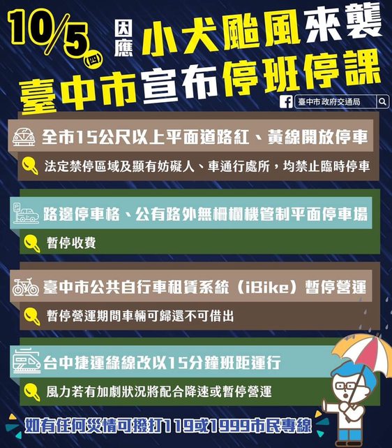 剛剛已經宣布停班停課,也發布了明天大眾運輸的營業狀況 1. 捷運 班距 15 分鐘運行,若風力增強則配合降速或暫停營運 2. 公共自行車 iBike 暫停營運,車輛可歸還不可借 3. 公車 a. 首班車延後至 07:30 - 08:00 發車,末班車不變 b. 每日超過 34 個班次的路線,降低發車班次 c. 每日 34 個班次以下的路線,依假日班表發車 d. 觀光公車路線(11、66副、151、153、309、888)停駛 結論 ibike 暫停營運;捷運班距拉長為 15 分鐘;公車減班 參考資料:交通局FB 相關圖片 https://i.imgur.com/dHt64y3.jpg