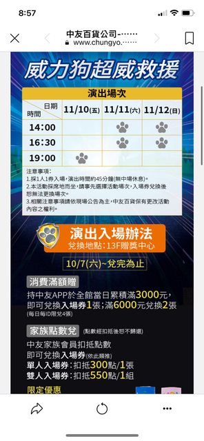 徵求項目:中友百貨汪汪隊表演門票 任一下午場