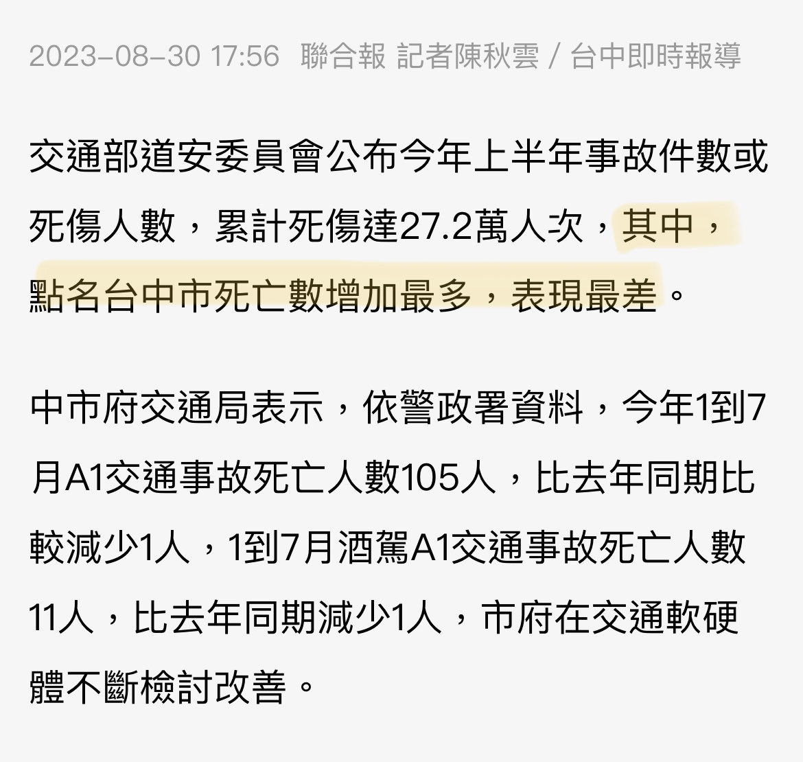 噓 radiwei : 台中今年每10萬人的車禍傷亡事故是全台第一 10/16 13:02