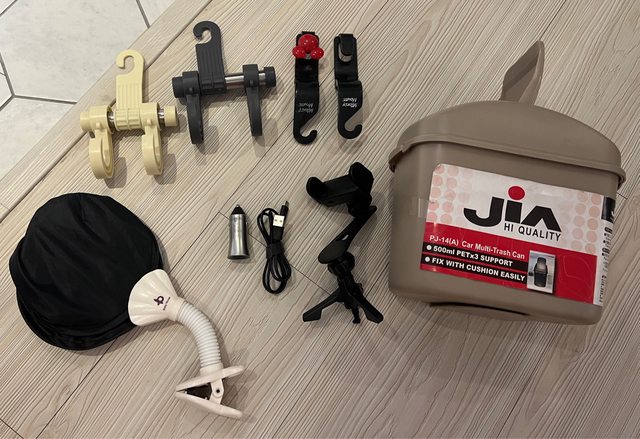 物品名稱:車上用品-垃圾桶、掛勾*4、手機架、遮陽夾、點菸器usb