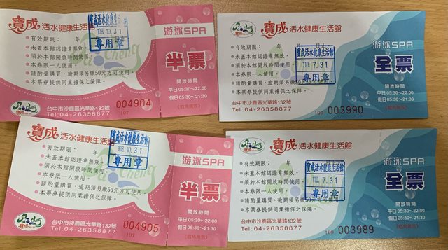 其它:建商附的,用不慣故出售。 品名:寶成泳券二大二小共四張 價格:$200 照片: