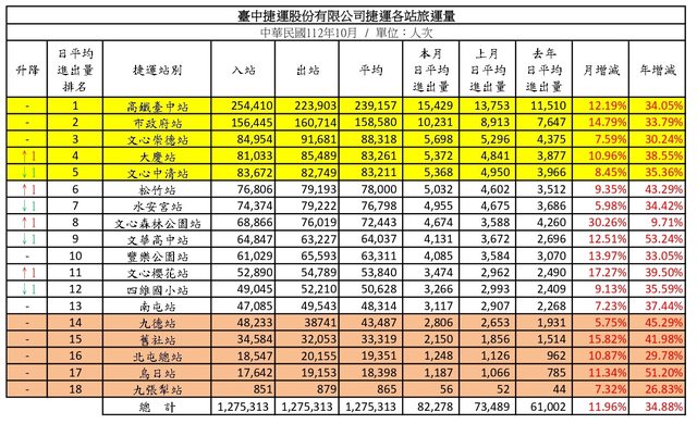 標題: [情報] 台中捷運112年10月各站旅運量