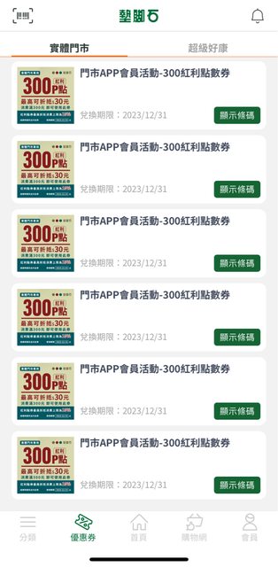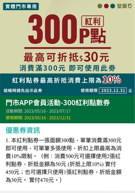 物品名稱:墊腳石門市APP會員活動-300紅利點數券*20張