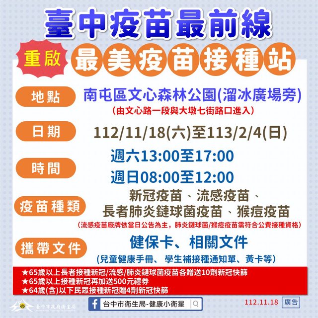 盧市長說明,文心森林公園接種站自11月18日至113年2月4日,每週六下午1時至5時及週日