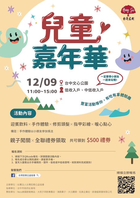 社團法人台灣宏樹公益協會要在台中舉辦第二屆關懷中低收入戶及低收入戶家庭兒童嘉年華