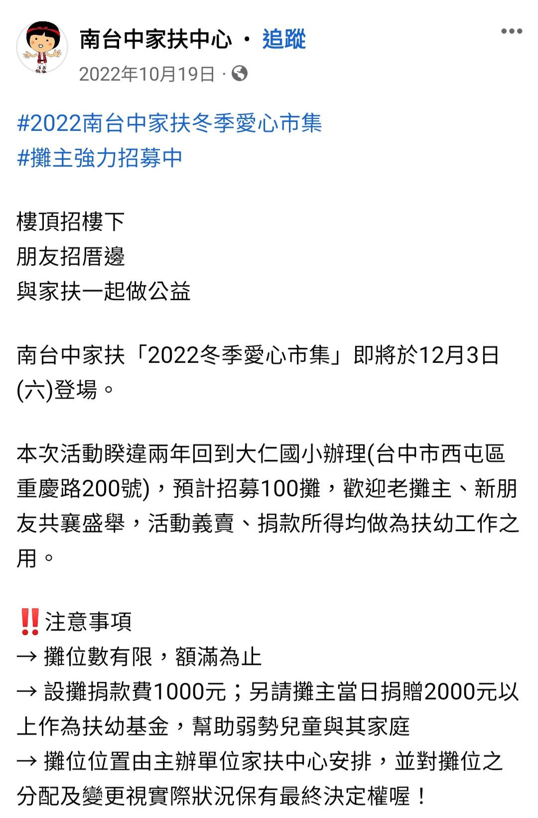 → seyfried : 關懷弱勢宗旨,除攤位捐款外,請每灘至少捐贈新台 11/22 00:48