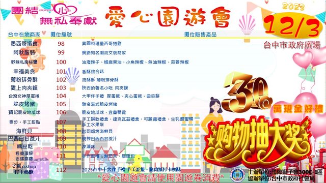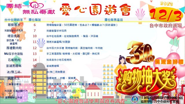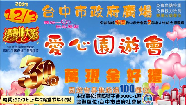 國際獅子會300C-1區將於12月3日早上9:00-下午16:00,在台中市政府廣場舉辦愛心園遊會活動,屆時超過百攤攤位種類應有盡有,特色美食小吃、拌手禮品也有過年前的採買和生活居家商品,邀請您12月3日撥冗參觀選購!