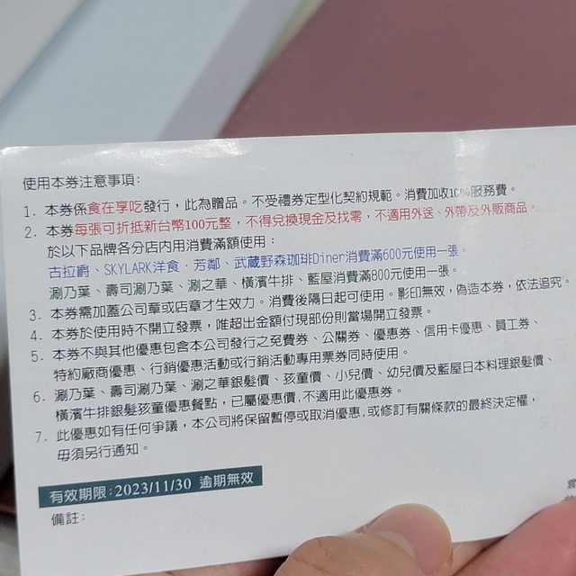 物品名稱:11/30即期 涮乃葉(雲雀)折價券1張
