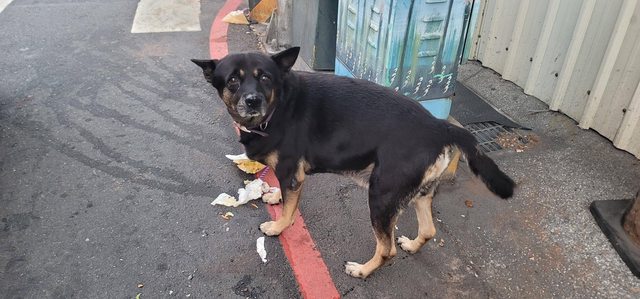 今天接近下午五點時,看到一隻黑狗在塗城路/美群路口,看到一隻狗在啃掉地上的飯包…