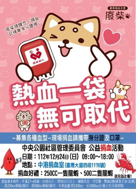12/24(日):台中中港捐血室 09:00~18:00 送龍蝦一隻/二隻