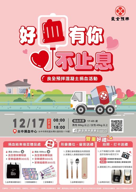 12/17(日):台中捐血中心 08:00~18:00 送家樂福禮券$300等/加贈全聯禮券$300