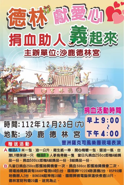 12/23(六):台中沙鹿德林宮 09:00~16:00 送米油等+抽獎1次/加贈人蔘烏骨雞+抽獎2次