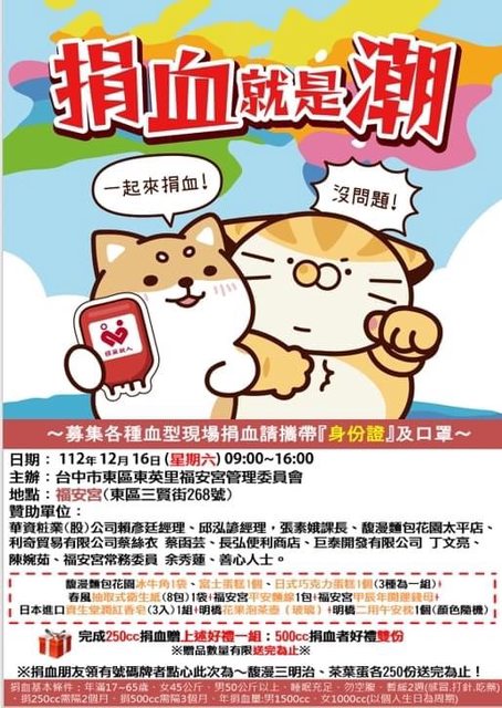 標題[資訊] 12月份台中捐血推廣 / 贈品資訊