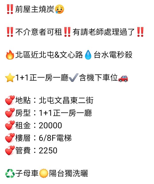 推 jkl4566654 : 目前西屯華夏46坪含機械車位可貓 租房客20k+管2k 感 12/02 23:17