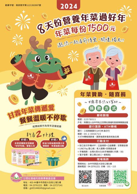 歡迎愛心響應捐贈年菜每份1,500元(開立捐款收據)