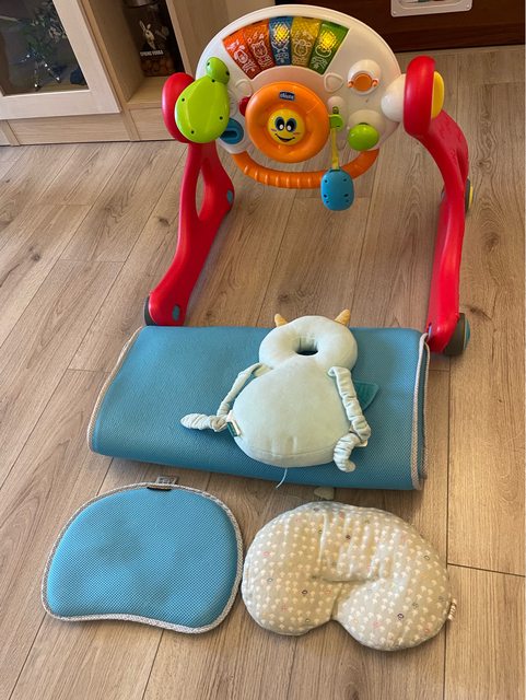 透氣床墊和枕頭(防窒息)/學坐、學步用護頸揹枕/chicco音樂架/五感刺激用的娃娃(