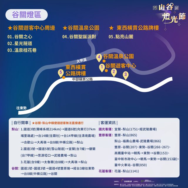每日點燈時間:16:30-21:00(谷關、梨山) 每半小時燈光秀