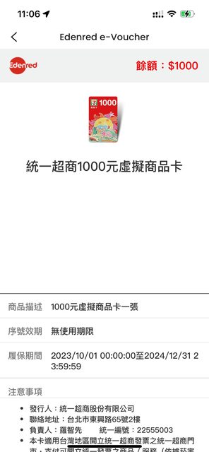 統一超商商品卡1000*2