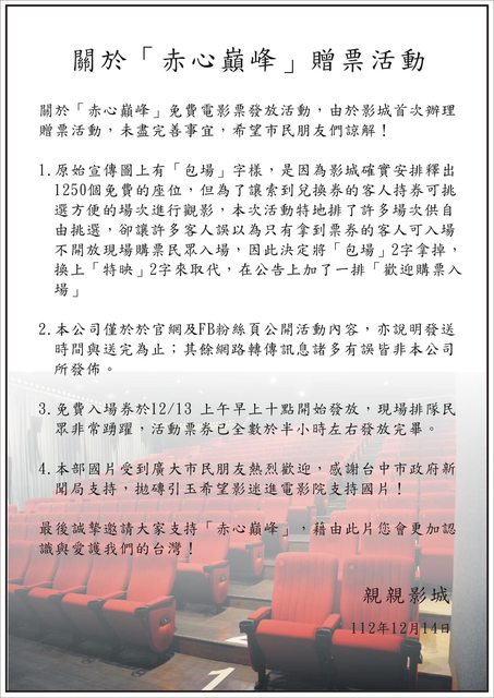 關於「赤心巔峰」免費電影票發放活動,由於影城首次辦理贈票活動,未盡完善事宜,希望