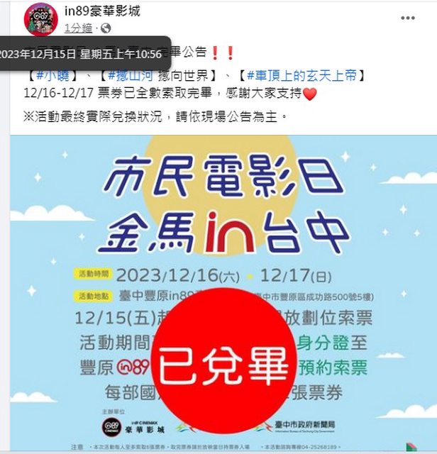 豐原in89豪華影城在10:56臉書公告,所有票券已經換完,謝謝收看。