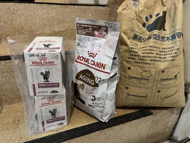 物品名稱:老貓飼料、貓砂、腎臟飼料