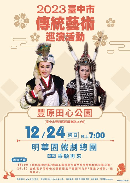 台中市政府文化局舉辦2023台中市傳統藝術巡演系列活動,將於12月24日晚上7點邀請明華園戲劇總團,在豐原田心公園壓軸演出經典好戲《乘願再來》,由明華園無敵小生孫翠鳳領銜主演,現場還有傳統工藝展現、填問卷送禮物及有獎徵答,歡迎民眾攜家帶眷一起來看表演。