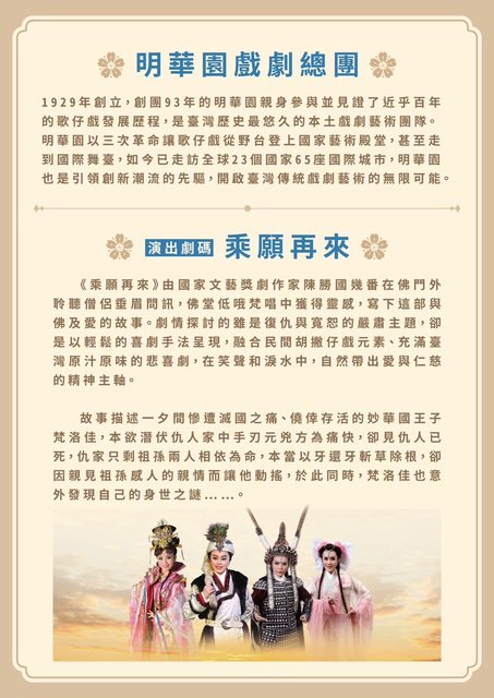 文化局說明,《乘願再來》是明華園戲劇總團的大型劇作,首席編導陳勝國以莎翁的四大悲劇的王子復仇記《哈姆雷特》為創作靈感,但有別於原作的徹底悲劇表現,賦予「愛」與「仁慈」的創作觀點,藉由歌仔戲傳統戲曲來詮釋人生真諦,進而以喜劇型態做結尾,喜愛戲曲的朋友們千萬別錯過!